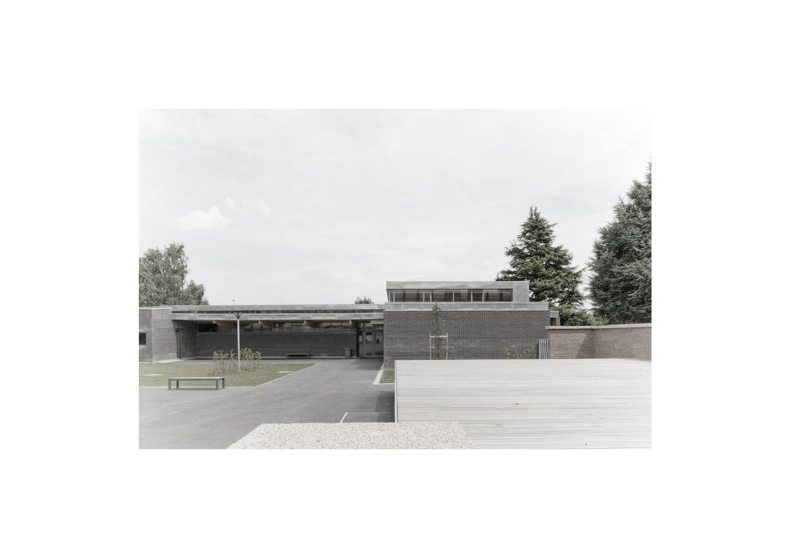 Depuis le porche, un parvis intérieur distribue un chemin qui se rétrécit vers l’entrée et discipline doucement la file des parents et des enfants. Le dispositif se poursuivra à l’intérieur de la construction, jusqu’au seuil de la classe.